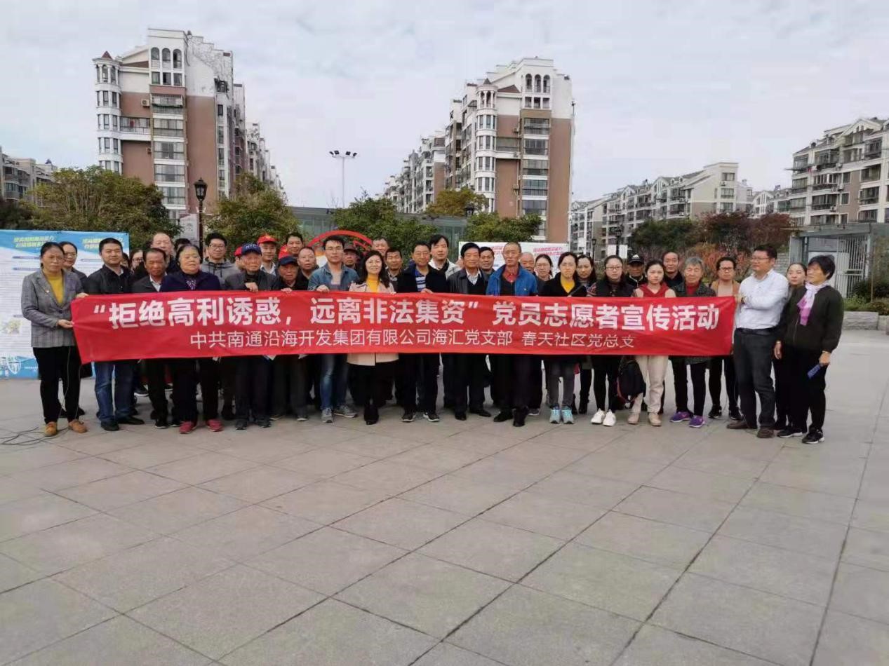 為進一步貫徹落實集團“不忘初心、牢記使命”主題教育工作部署,11月23日上午,海匯黨支部結合本月主題黨日活動,聯系工作實際,與開發區春天社區黨總支聯合開展以“拒絕高利誘惑,遠離非法集資”為主題的志愿宣傳活動。